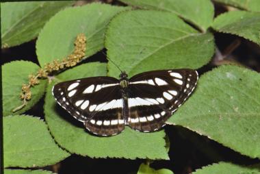 分布は県内のほぼ全域。市街地でも見かけることがある。林内や林の縁に多く、樹上をゆっくりと滑空し、各種の花を訪れる。また、好んで路上で吸水する。ミスジチョウより小形、前ばねの付け根から延びる長い白線は途中で切れる。幼虫はクズ、フジ、ニセアカシアなどを食べる。