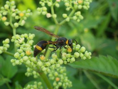 体長25mm内外。県内ではほぼ全域に分布し、ハギの花などで良く見る。スズメバチの仲間ではなく、トックリバチの仲間である。
