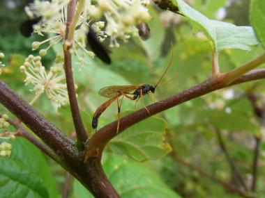 体長30mm内外。県内では主に山地で見られ、道路わきの草地などに多い。よくにた種が多数いる。ガの幼虫に寄生する。