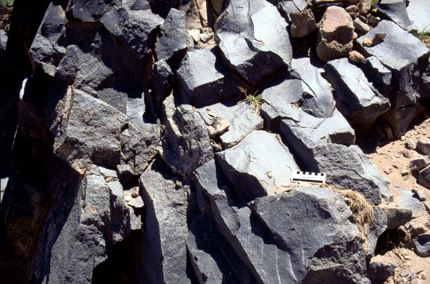 サンホセ火山をつくる安山岩質玄武岩溶岩の露頭接写。急峻な山体を登る途中に見られる岩石全体は節理が発達して、ブロック状にわれやすい。