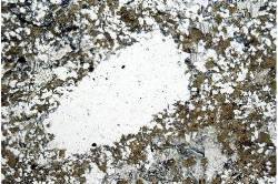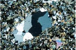 偏光顕微鏡写真 イスア地方に分布する38億年前の礫岩層の偏光顕微鏡写真。上はオープンニコル、下はクロスニコル。オープンニコルで中央の白くて丸い部分が、礫の部分である。