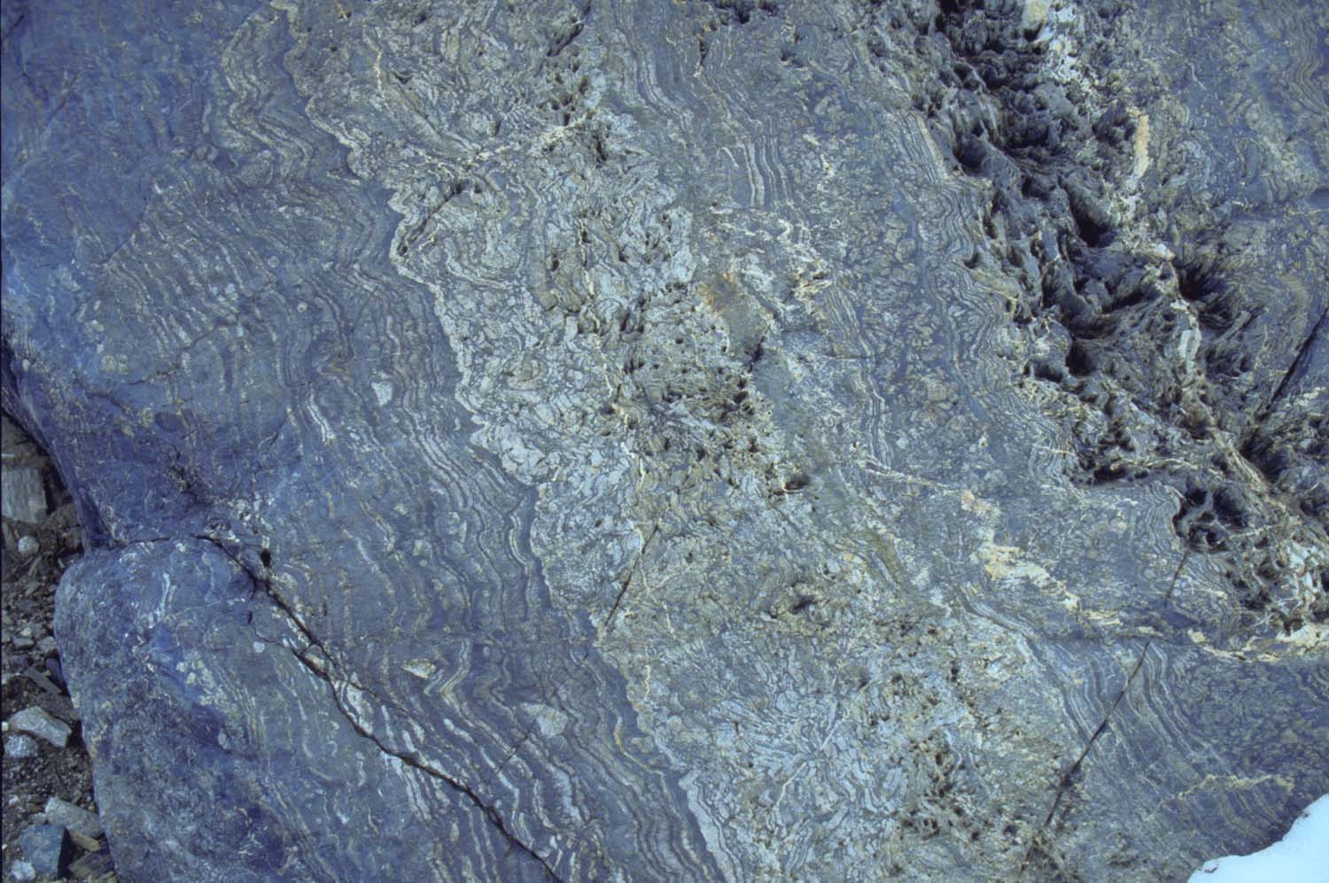 イスア地域の西部に露出する38億年前の縞状鉄鉱層。厚さ数ミリ〜1cm前後の鉄の濃集層とチャート層が互層している。きれいな縞状構造がみられる。黒い部分が鉄分の多いところ。